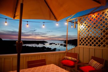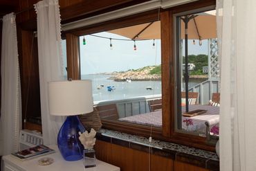 External stairs up one flight to the oversized deck and first views of Rockport Harbor and the Atlantic Ocean.